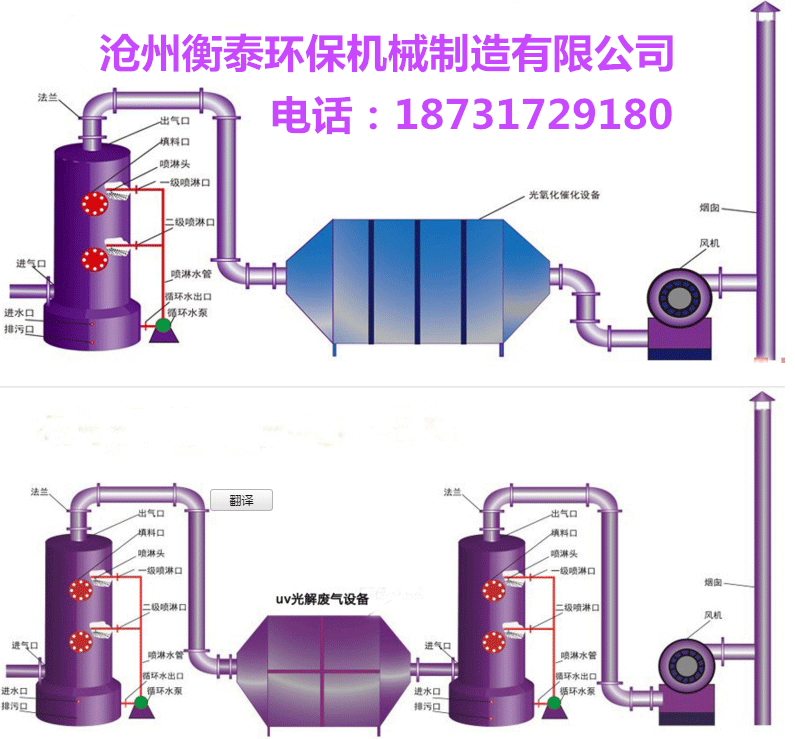 進風(fēng)管道--進入噴淋塔利用液體水分解吸收有害氣體--出風(fēng)帽蓋--排風(fēng)管--光氧催化廢氣凈化器分解噴漆廢氣--風(fēng)機煙囪排出干凈的空氣。噴淋塔采用物理液體吸收有害氣體和蒸氣時純物理溶解過程。在水中溶解有害氣體和蒸氣,由風(fēng)管進入光氧廢氣凈化器中凈化廢氣,最后由風(fēng)機排入大氣中。